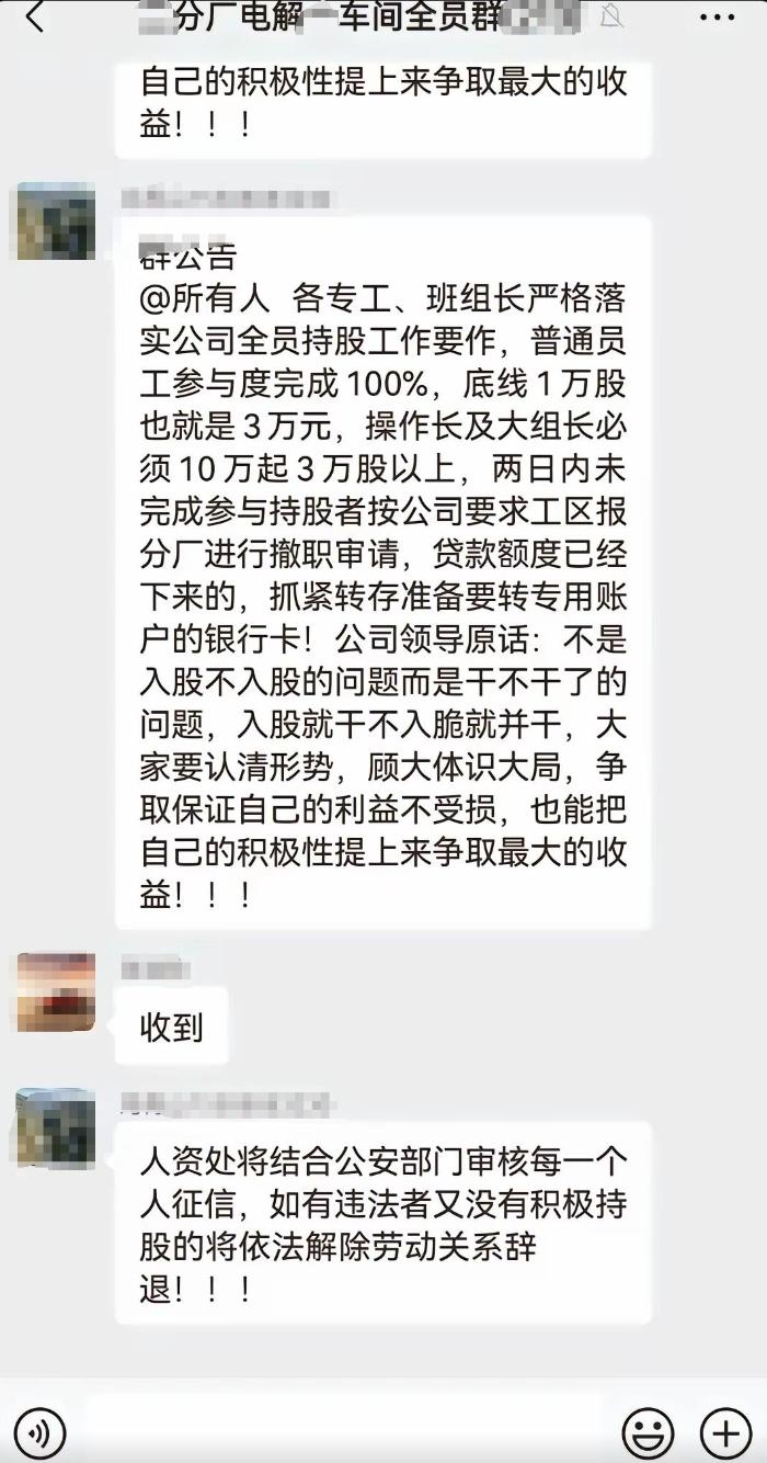 根据爆料截图显示,在名为“某分厂电解车间全员群”的微信群内,有人发布群公告称,各专工、班组长严格落实公司全员持股工作,“普通员工参与度完成100%,底线1万股也就是3万元,操作长及大组长必须10万起3万股以上,两日内未完成参与持股者按公司要求工区报分厂进行撤职审请,贷款额度已经下来的,抓紧转存准备要转专用账户的银行卡!公司领导原话:不是入股不入股的问题而是干不干了的问题,入股就干不入脆就并干,大家要认清形势,顾大体识大局,争取保证自己的利益不受损,也能把自己的积极性提上来争取最大的收益!!!”随后群里还强调,“人资处将结合公安部门审核每一个人征信,如有违法者又没有积极持股的将依法解除劳动关系辞退!!!”根据发布者留言,涉事公司疑为广元中孚铝业。大皖新闻记者根据截图中的昵称信息尝试与公告发布人取得联系,但对方电话始终无人接听。