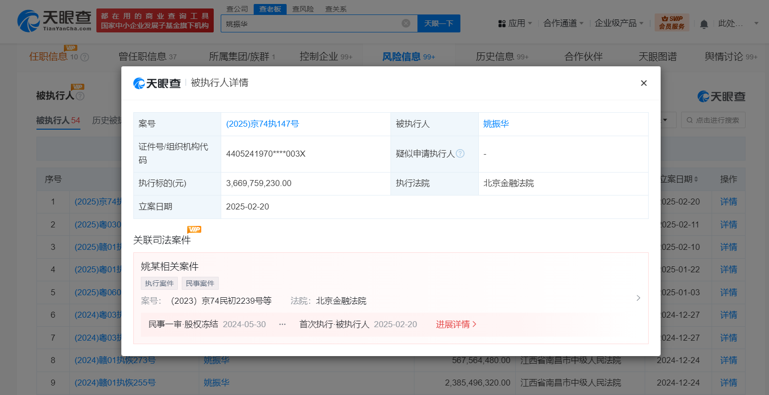天眼查法律诉讼信息显示,近日,姚振华新增一则被执行人信息,执行标的36.6亿余元,执行法院为北京金融法院。
