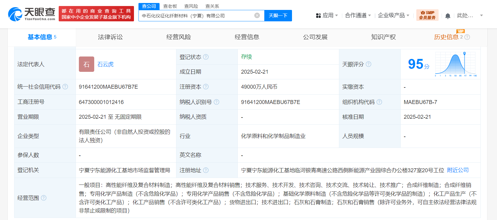 天眼查App显示,近日,中石化仪征化纤新材料(宁夏)有限公司成立,法定代表人为石云虎,注册资本4.9亿人民币,经营范围含高性能纤维及复合材料制造、高性能纤维及复合材料销售、合成纤维制造、合成纤维销售、专用化学产品制造、化工产品生产等。股权全景穿透图显示,该公司由中国石化仪征化纤有限责任公司全资持股,后者为中国石化(600028)全资子公司。