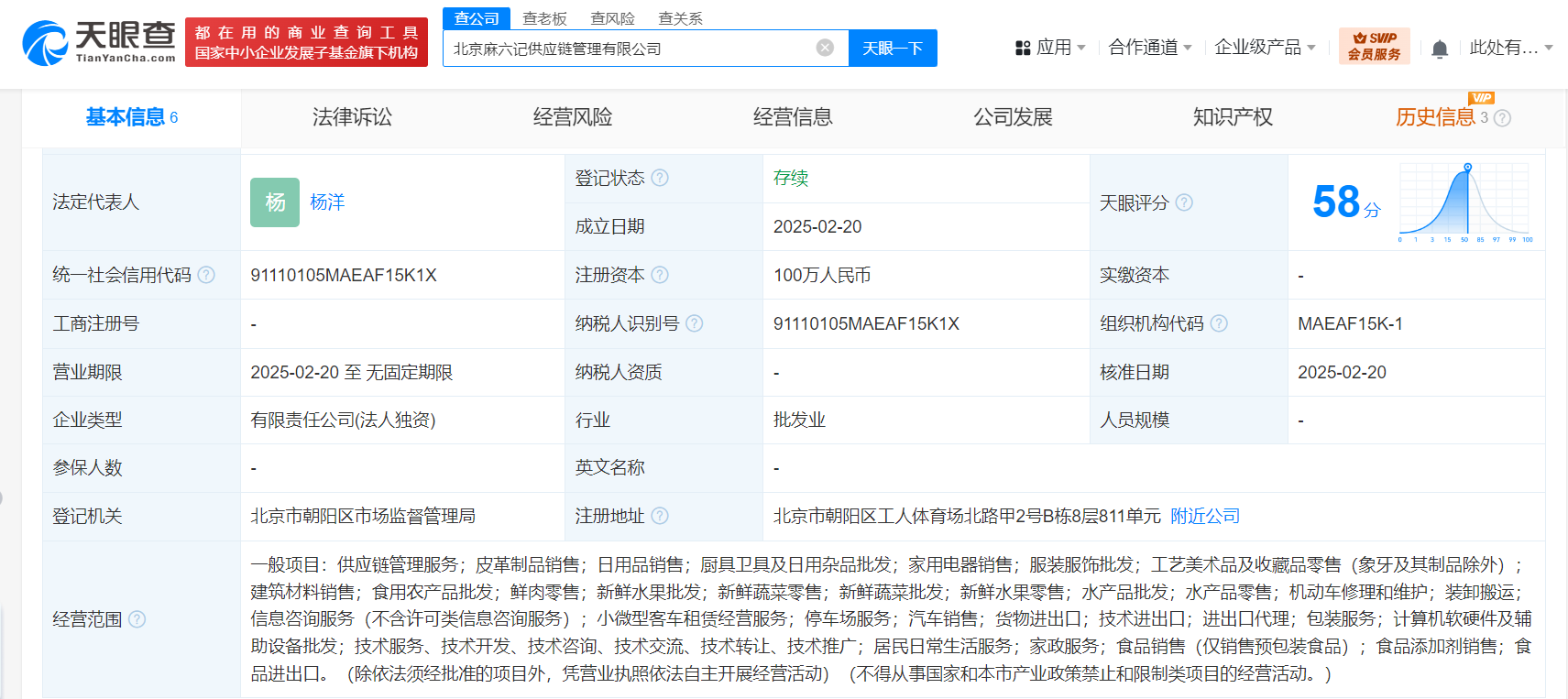 天眼查App显示,近日,北京麻六记供应链管理有限公司成立,法定代表人为杨洋,注册资本100万人民币,经营范围含供应链管理服务、皮革制品销售、家用电器销售、服装服饰批发、信息咨询服务等。股东信息显示,该公司由北京麻六记餐饮管理有限公司全资持股,汪小菲担任后者董事。