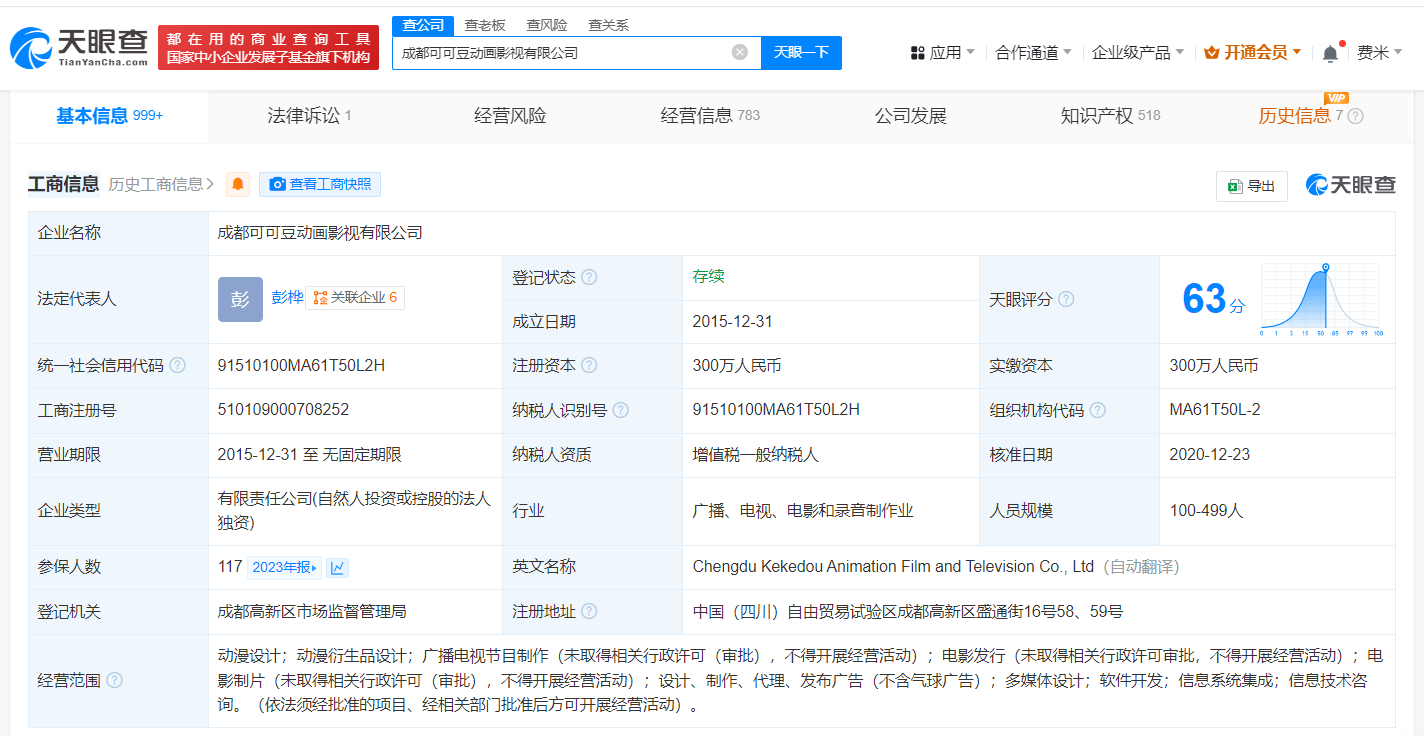 天眼查App显示,近日,成都可可豆动画影视有限公司新增广播电视节目制作行政许可,许可机关为高新区教育文化体育局,有效期至2027年2月16日。