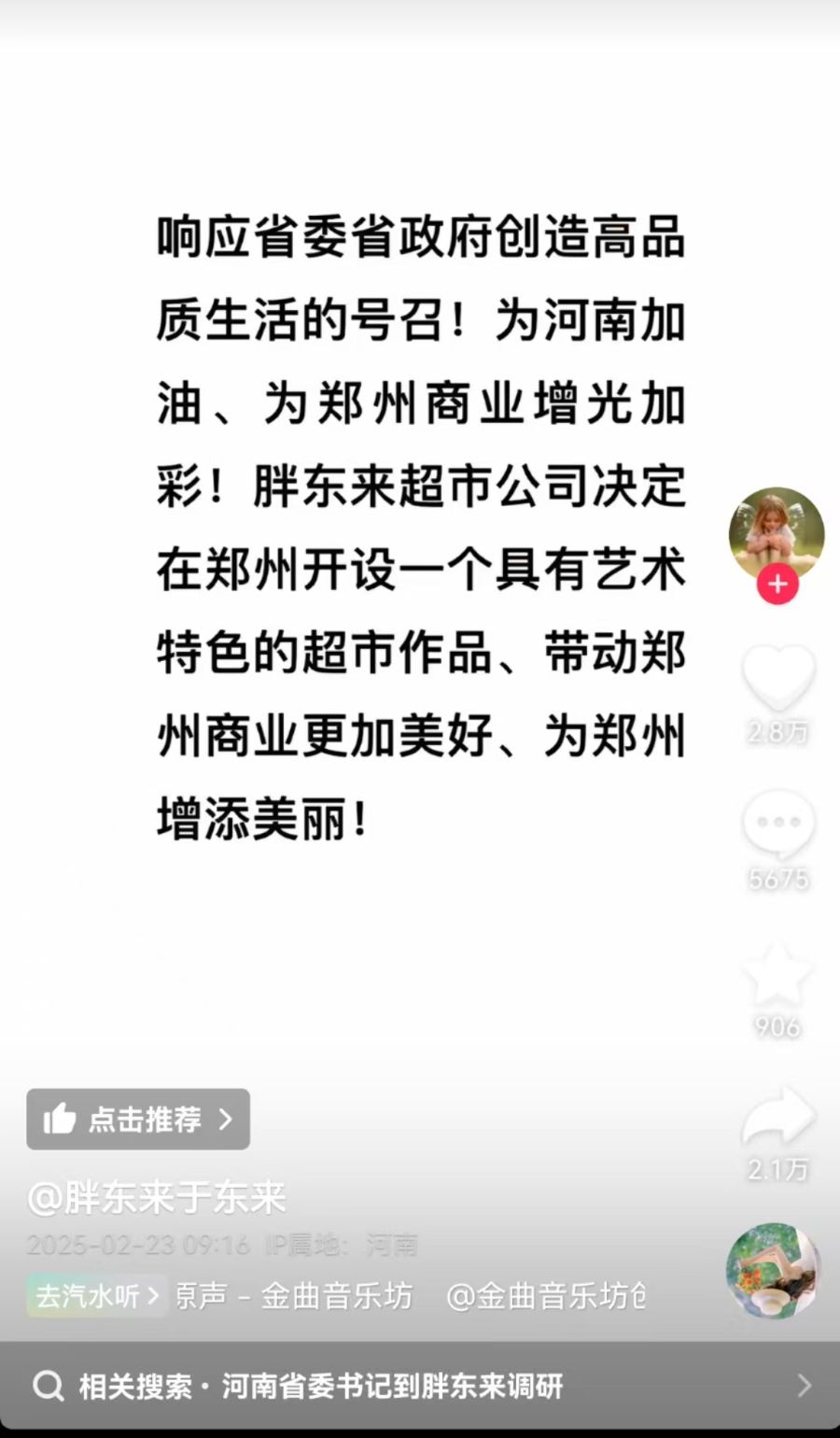 2月23日,胖东来创始人于东来在个人账号发布消息称,“胖东来超市公司决定在郑州开设一个具有艺术特色的超市作品、带动郑州商业更加美好、为郑州增添美丽!”