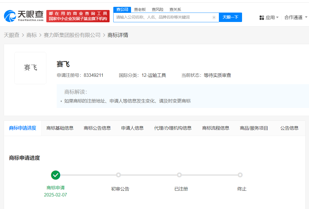 天眼查知识产权信息显示,近日,赛力斯(601127)申请注册“赛飞”商标,国际分类为运输工具,当前商标状态为等待实质审查。