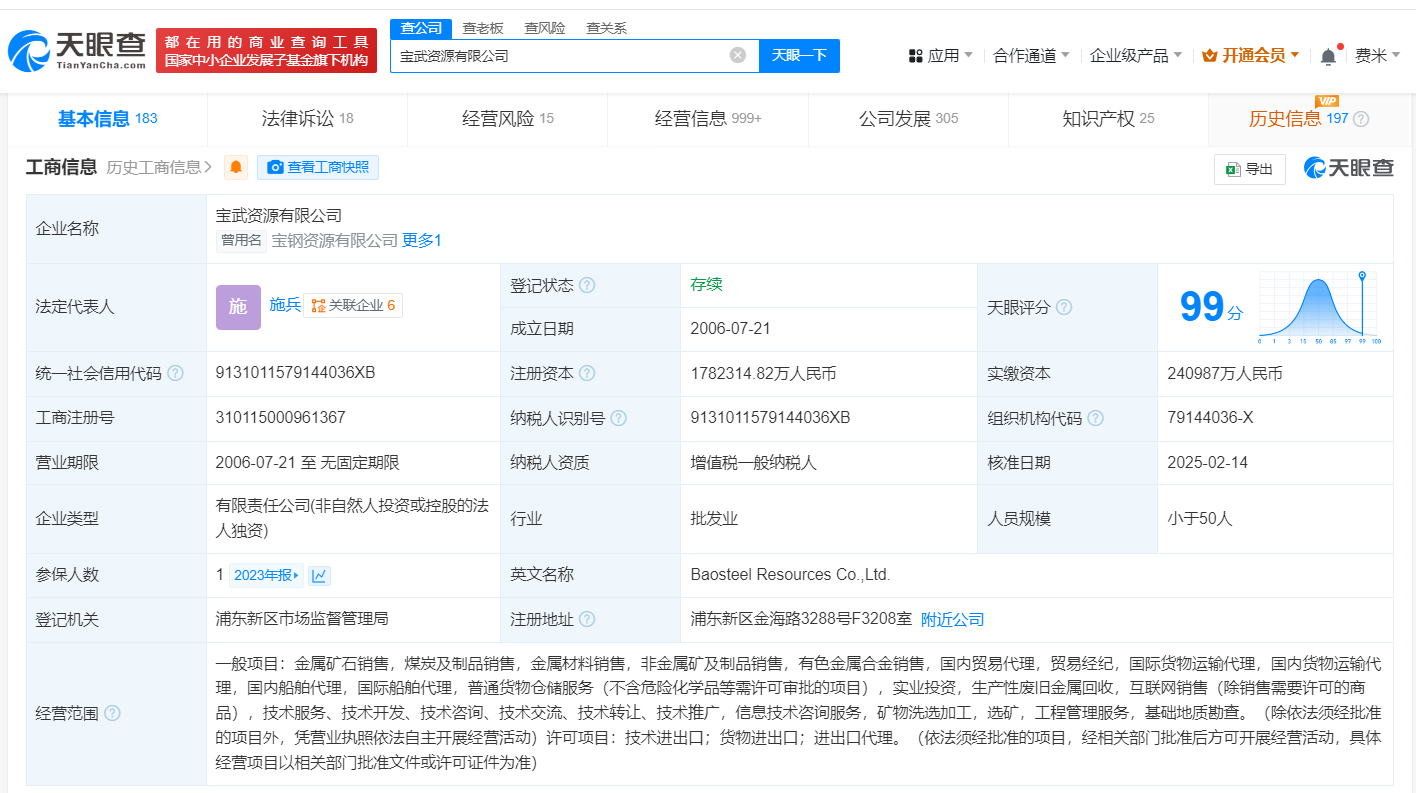 该公司成立于2006年7月,法定代表人为施兵,经营范围含金属矿石销售、煤炭及制品销售、金属材料销售等,由中国宝武钢铁集团有限公司全资持股。