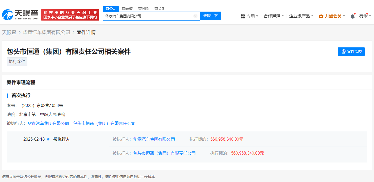 天眼查法律诉讼信息显示,近日,华泰汽车集团有限公司、包头市恒通(集团)有限责任公司新增一则被执行人信息,执行标的5.6亿余元,执行法院为北京市第二中级人民法院。