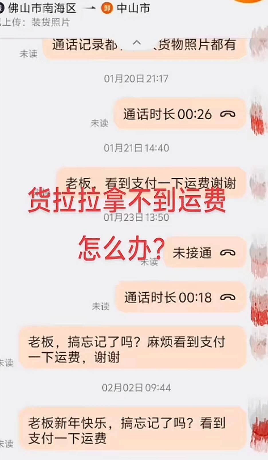 在短视频平台上,也有不少司机讲述自己的遭遇,展示了追款遭遇的各种推脱。一名司机视频中晒出的聊天记录显示,他从1月20日开始小心翼翼追问340元货款的事情,对方约定的时间不断延期,直到2月19日才付款。他在文案中写,原本是钱货两清的交易,“却每天要装孙子说好话,生怕哪个客户把我拉黑了。 ”