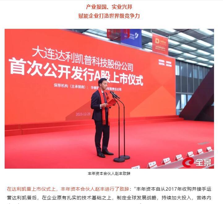 2024年1月,达利凯普(SZ301566)上市后不久,公司实际控制人赵丰在总结成功经验时提到这样一句话:“我们很‘勇敢’地派了丰年资本一位年轻的优秀投资经理去担任达利凯普的董事长⋯⋯后续的事实也证明了,我们的决定是对的。”