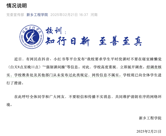 近日,有网友发消息称,河南新乡工程学院教务处下发新规,其中除寝室禁止存放违禁品和晚归累计三次记一次处分外,还有一项规定是白天没课的时候不允许学生在寝室睡懒觉,被抓到者会被记过。2月21日,新乡工程学院发布情况说明称,针对“我校要求学生平时没课时不要在寝室睡懒觉(白天8点至晚11点)”“强制课间操”等信息,学校高度重视,立即展开调查。经调查核实,学校教务处及其他部门从未发布过此类规定,网传信息不属实。学校现已向全体学生进行了澄清。