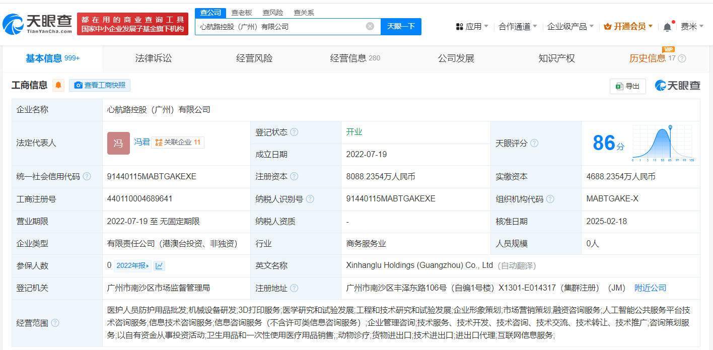 该公司成立于2022年7月,法定代表人为冯君,经营范围含医护人员防护用品批发、机械设备研发、3D打印服务等,现由广州禅诺企业咨询合伙企业(有限合伙)、Lifinity Medical Limited等及上述新增股东共同持股。官网显示,该公司专注于心脏电生理标测和脉冲电场消融领域。