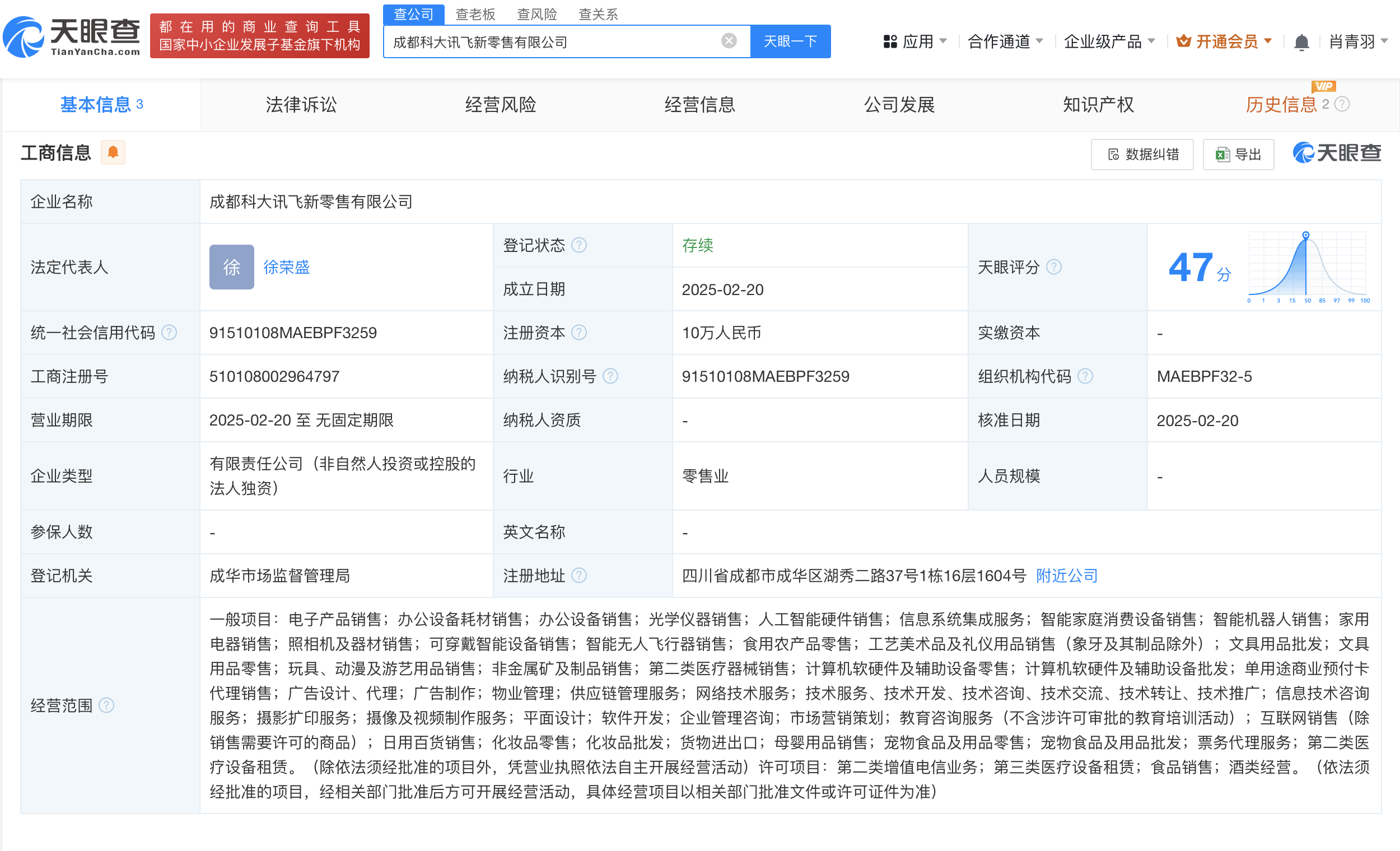 天眼查App显示,近日,成都科大讯飞新零售有限公司成立,法定代表人为徐荣盛,注册资本10万人民币,经营范围包括电子产品销售、办公设备耗材销售、办公设备销售、光学仪器销售、人工智能硬件销售、信息系统集成服务、智能家庭消费设备销售、智能机器人销售等。股权全景穿透图显示,该公司由科大讯飞(002230)旗下安徽讯飞新零售有限公司全资持股。