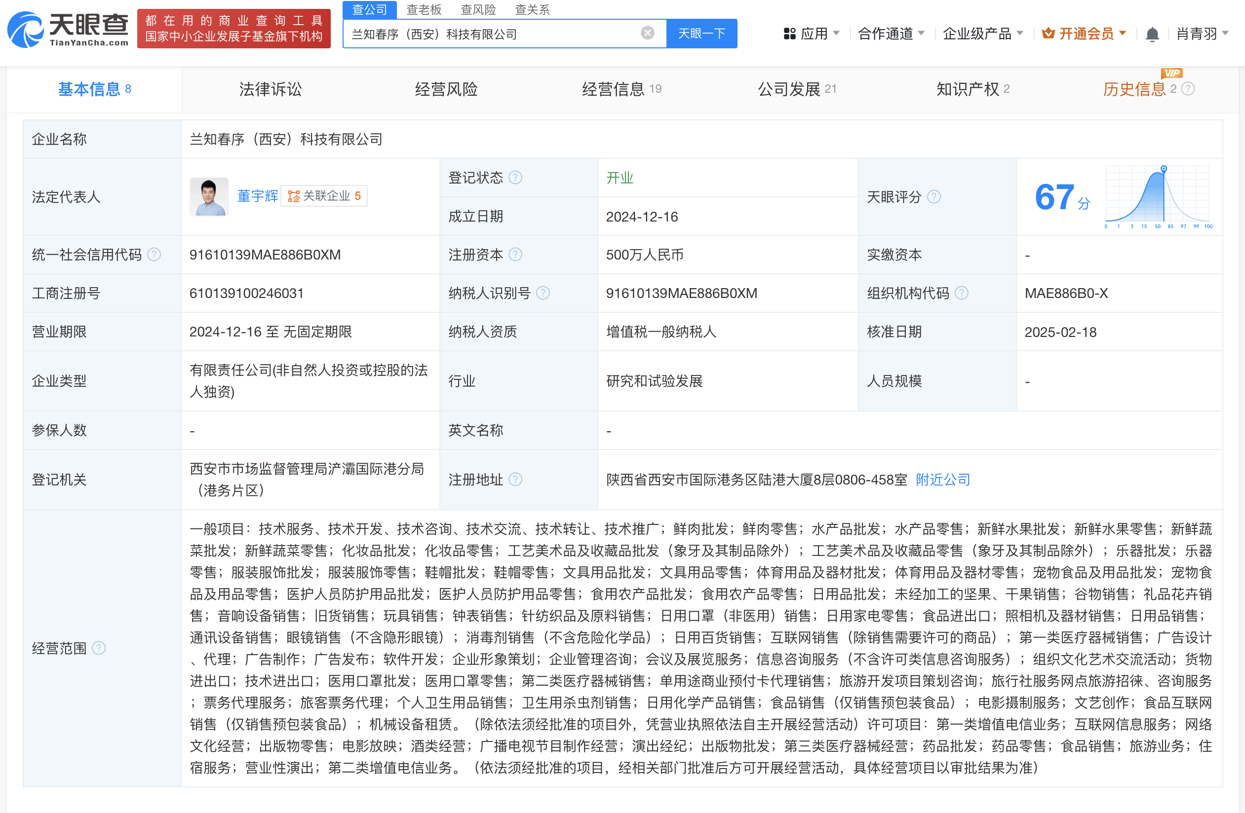 兰知春序(西安)科技有限公司成立于2024年12月,法定代表人为董宇辉,注册资本500万人民币,经营范围包括互联网销售、企业形象策划、企业管理咨询、会议及展览服务、信息咨询服务等,由子三省(北京)科技有限公司全资持股,董宇辉为该公司实际控制人。知识产权信息显示,2月17日,该公司登记“平安喜乐帆布包”“平安喜乐帆布包(黄色)”作品著作权,作品类别为美术。