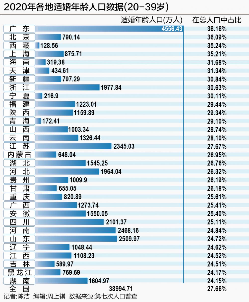 到了2020年,根据全国人口普查数据,北京的适婚年龄人口在总人口中的占比仍然高达36.09%,在各个省份中排名第二位,仅次于广东,也远超全国27.66%的水平。