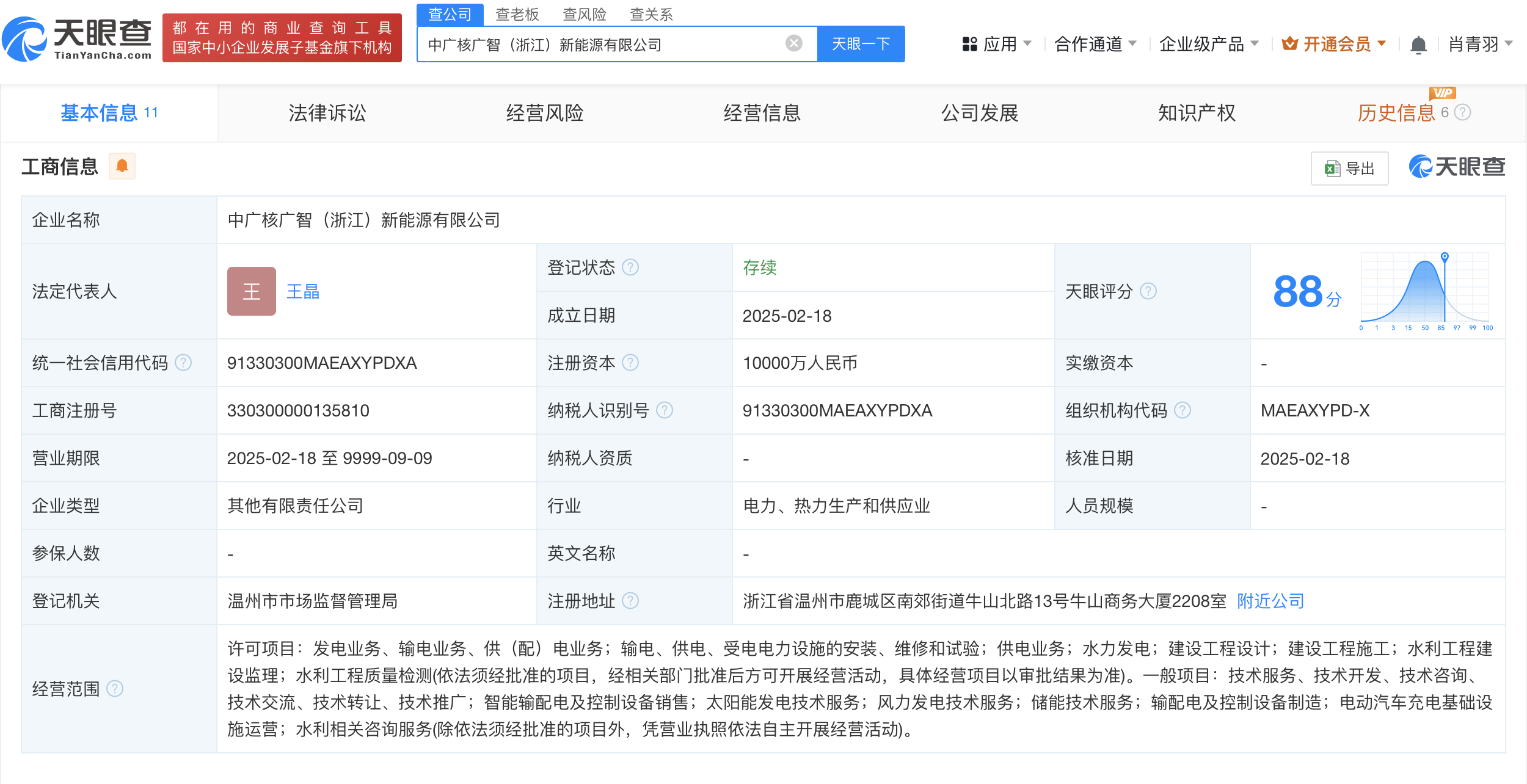 天眼查App显示,近日,中广核广智(浙江)新能源有限公司成立,法定代表人为王晶,注册资本1亿人民币,经营范围含智能输配电及控制设备销售、太阳能发电技术服务、风力发电技术服务、储能技术服务、输配电及控制设备制造、电动汽车充电基础设施运营等,由中广核风电有限公司、温州市能源发展有限公司共同持股。