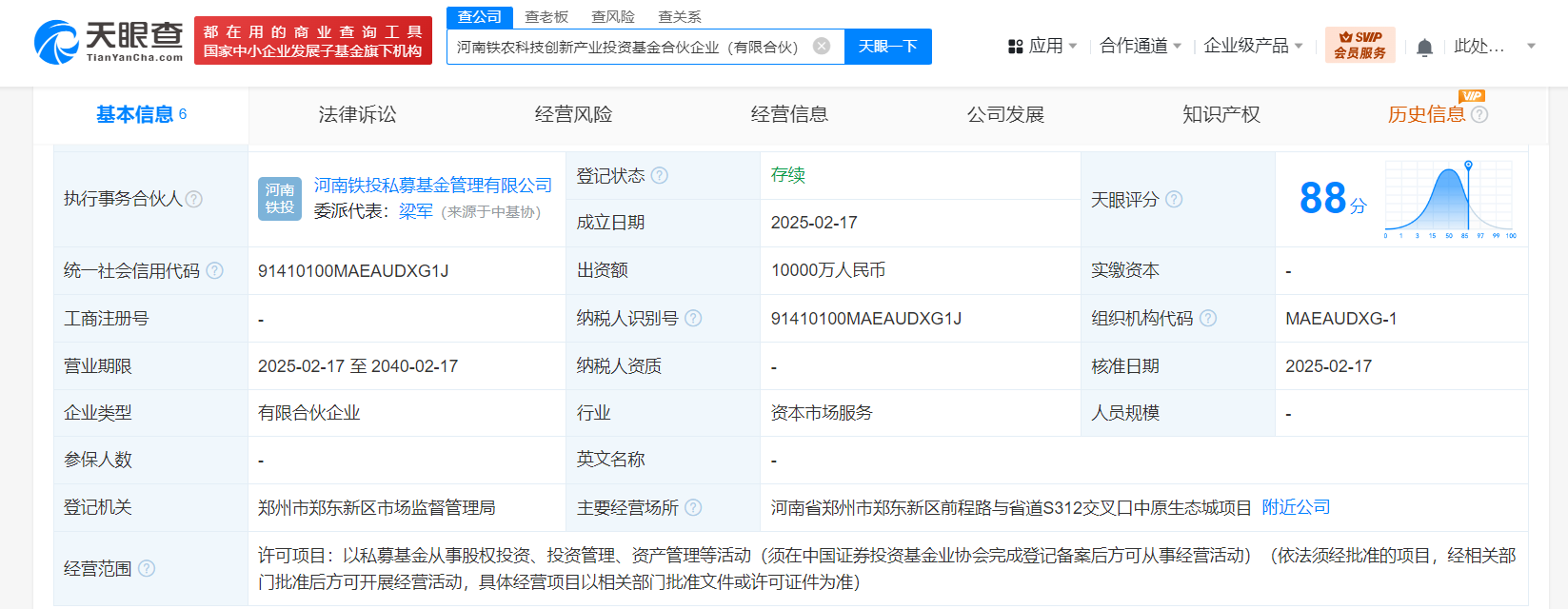 天眼查App显示,近日,河南铁农科技创新产业投资基金合伙企业(有限合伙)成立,执行事务合伙人为河南铁投私募基金管理有限公司,出资额1亿人民币,经营范围为以私募基金从事股权投资、投资管理、资产管理等活动。合伙人信息显示,该基金由河南铁投私募基金管理有限公司、河南铁投资本控股有限公司、河南铁建投生态城开发有限公司、河南农大资产经营有限责任公司共同出资。