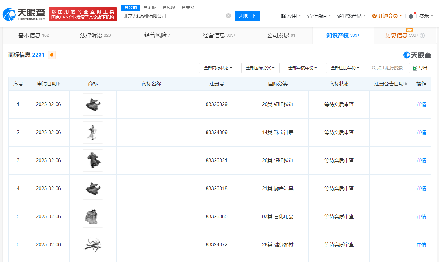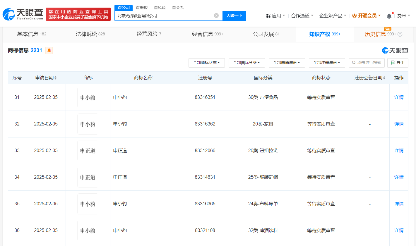 天眼查知识产权信息显示,近日,哪吒2出品方北京光线影业有限公司申请注册多枚“申正道”“申小豹”等文字商标以及无量仙翁、石矶娘娘等多名角色图形商标,国际分类包含钮扣拉链、厨房洁具、日化用品等,当前商标状态均为等待实质审查。