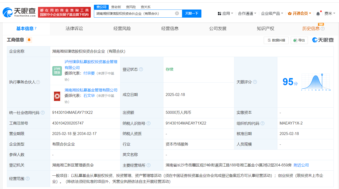 天眼查App显示,近日,湖南湘投璞信股权投资合伙企业(有限合伙)成立,执行事务合伙人为泸州璞泉私募股权投资基金管理有限公司、湖南湘投私募基金管理有限公司,出资额5亿人民币,经营范围为以私募基金从事股权投资、投资管理、资产管理等活动,由泸州老窖集团旗下四川璞信产融投资有限责任公司、湖南能源集团旗下湖南湘投产业投资基金合伙企业(有限合伙)、长沙市产业投资基金合伙企业(有限合伙)等共同出资。