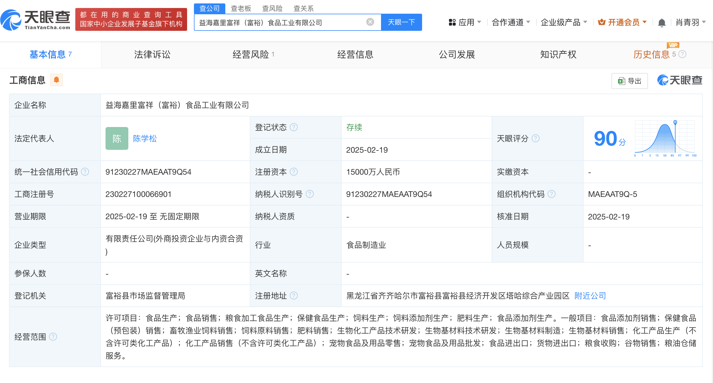 天眼查App显示,2月19日,益海嘉里富祥(富裕)食品工业有限公司成立,法定代表人为陈学松,注册资本1.5亿人民币,经营范围含食品生产、食品销售、粮食加工食品生产、保健食品生产、饲料生产、饲料添加剂生产、肥料生产等,由富祥药业(300497)、金龙鱼(300999)共同持股。