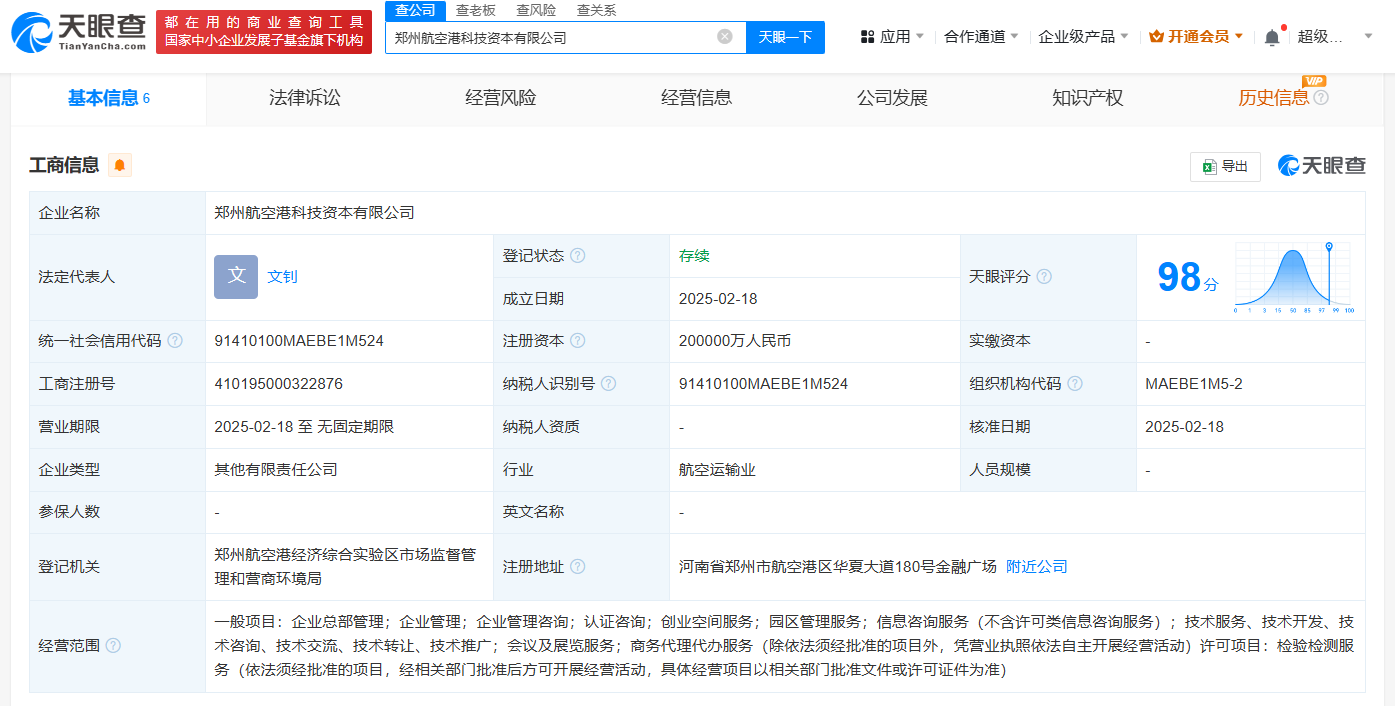 天眼查App显示,近日,郑州航空港科技资本有限公司成立,法定代表人为文钊,注册资本20亿人民币,经营范围包括企业总部管理、创业空间服务、园区管理服务、会议及展览服务等。股东信息显示,该公司由郑州航空港科创投资集团有限公司全资持股。