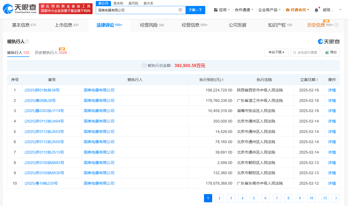 天眼查法律诉讼信息显示,2月19日,国美电器有限公司新增3条被执行人及恢复执行信息,执行标的合计3.8亿余元,涉及金融借款合同纠纷等案件,执行法院为陕西省西安市中级人民法院、广东省湛江市中级人民法院、淄博市张店区人民法院。