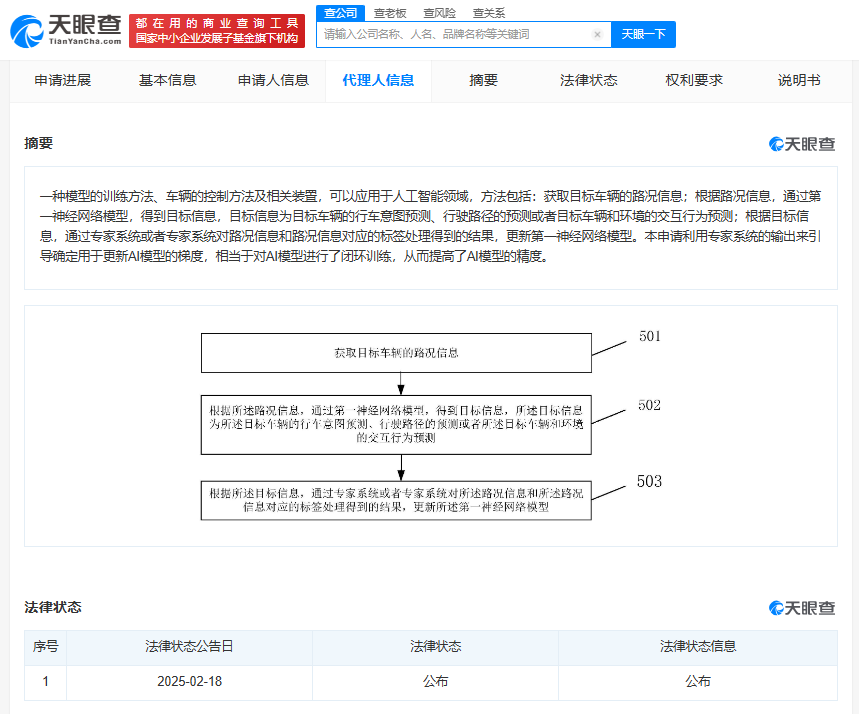 天眼查App显示,2月18日,华为技术有限公司申请的“模型的训练方法、车辆的控制方法及相关装置”专利公布。