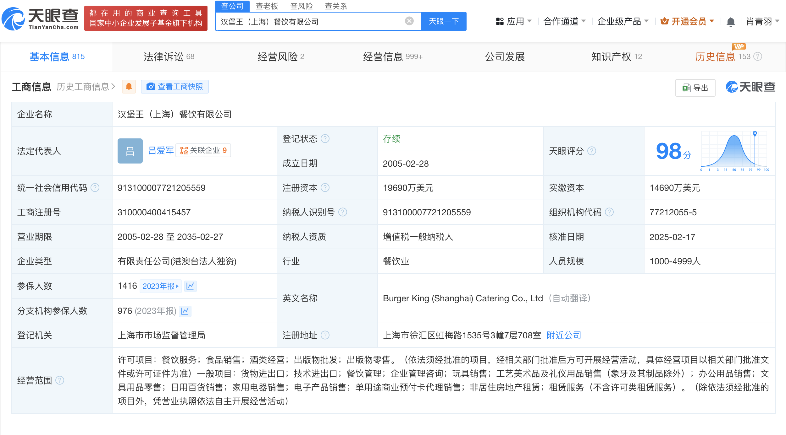 值得注意的是,汉堡王(上海)餐饮有限公司也发生变更,注册资本由约1.47亿美元增至约1.97亿美元。该公司成立于2005年2月,法定代表人为吕爱军,由汉堡王(中国)投资有限公司全资持股。