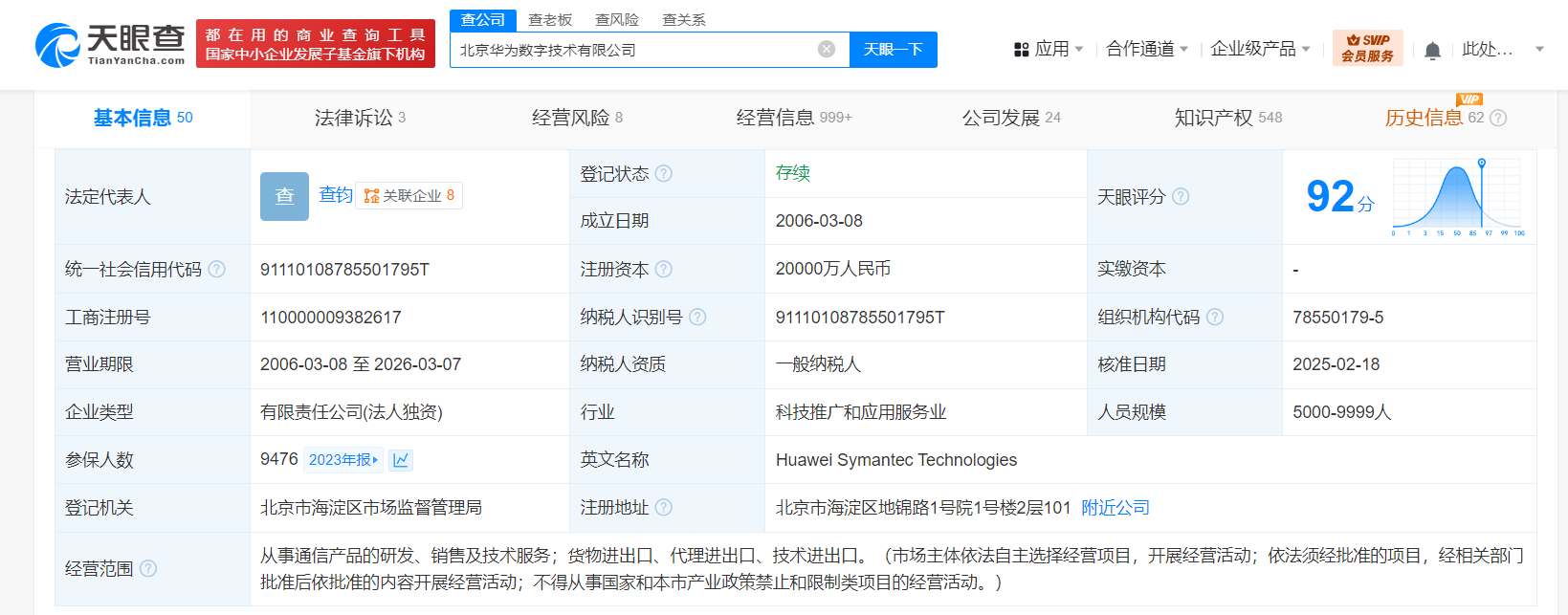 该公司成立于2006年3月,法定代表人为查钧,经营范围含从事通信产品的研发、销售及技术服务,货物进出口、代理进出口、技术进出口。股东信息显示,该公司由华为技术有限公司全资持股。
