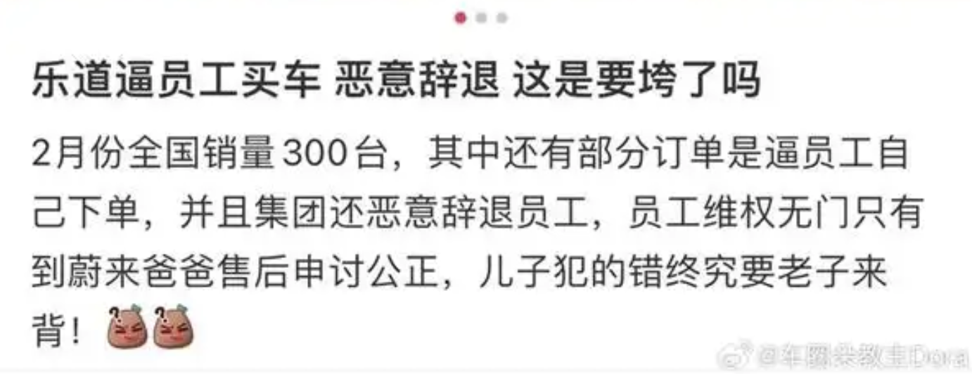 日前,一则“乐道逼迫员工买车 遭恶意辞退”的帖子引起网友热议。