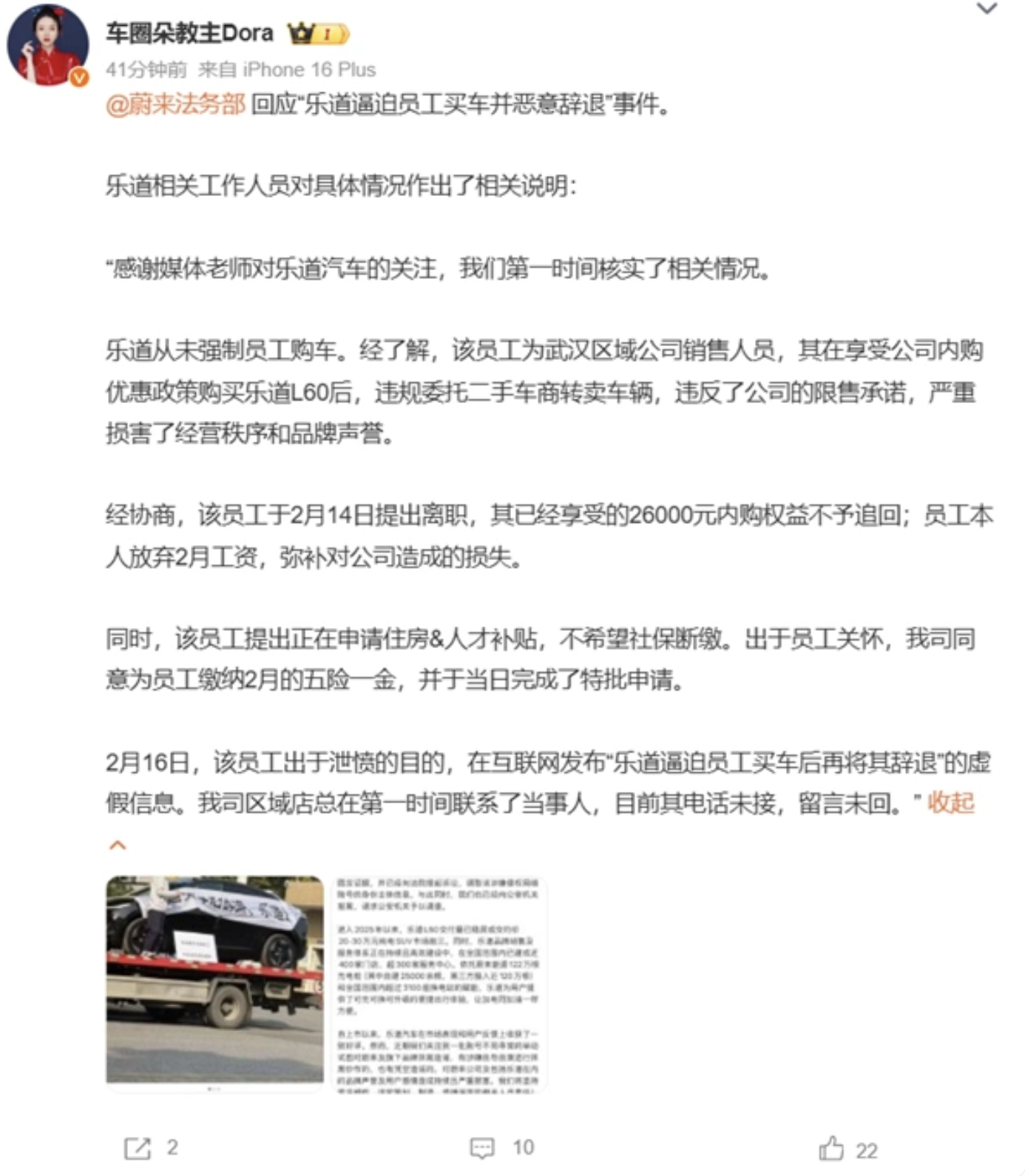 乐道第一时间核实了相关情况,乐道从未强制员工购车。经了解,该员工为武汉区域公司销售人员,其在享受公司内购优惠政策购买乐道L60后,违规委托二手车商转卖车辆,违反了公司的限售承诺,严重损害了经营秩序和品牌声誉。