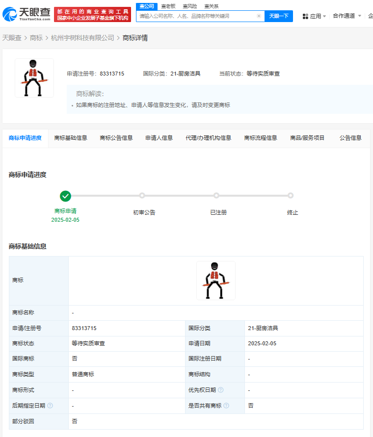 天眼查App显示,近日,杭州宇树科技有限公司申请注册一枚“春晚机器人”样式图形商标,国际分类为厨房洁具,当前商标状态为等待实质审查。