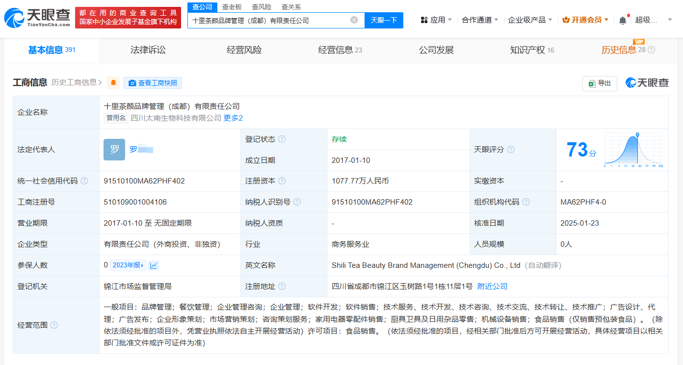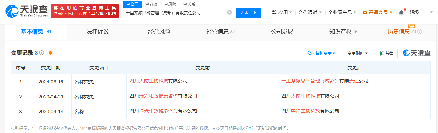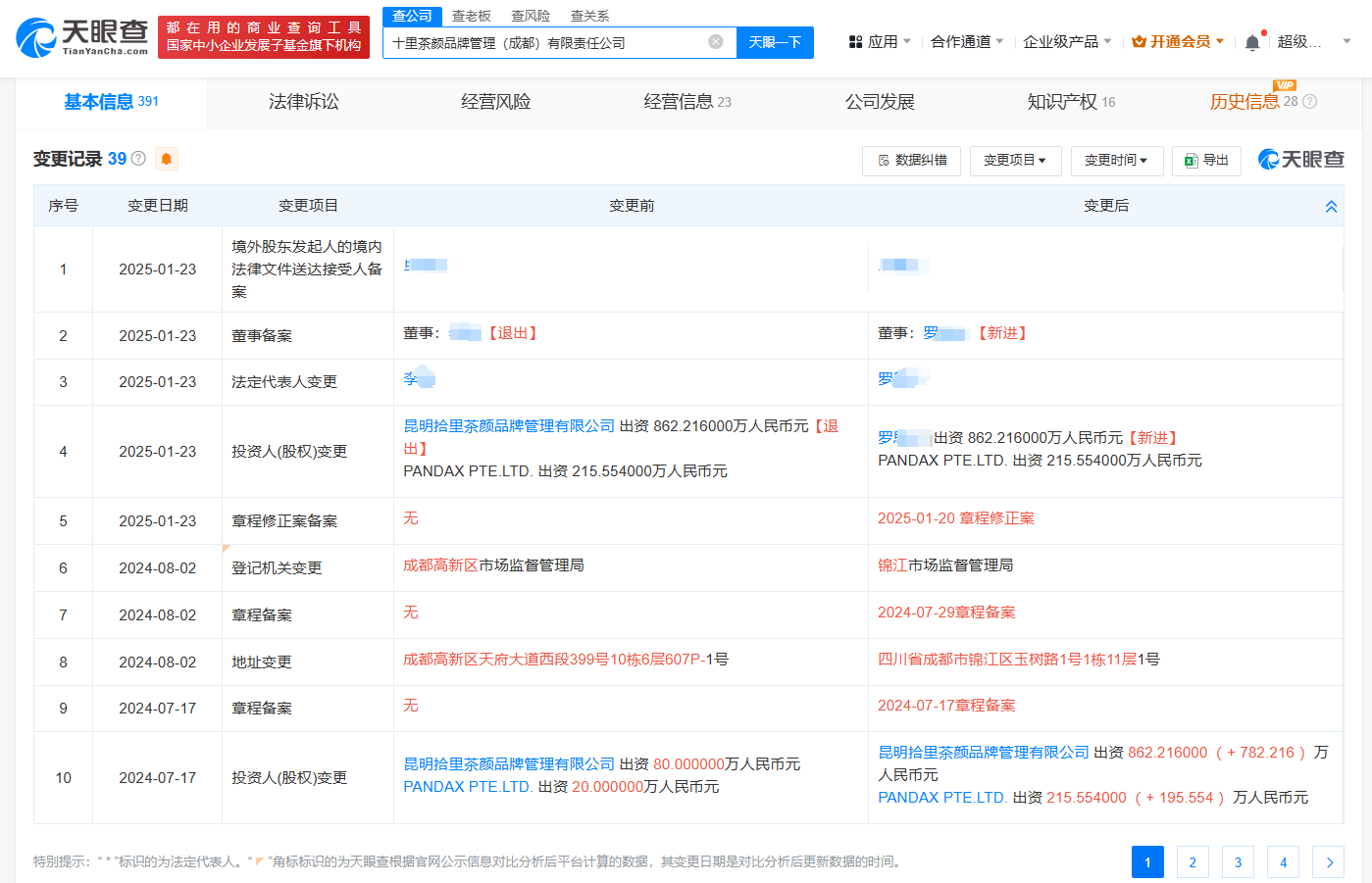 天眼查App显示,十里茶颜关联公司十里茶颜品牌管理(成都)有限责任公司成立于2017年1月,法定代表人为罗某某,注册资本1077.77万人民币,经营范围包括品牌管理、餐饮管理、企业管理咨询、企业管理等,由罗某某、PANDAX PTE.LTD.共同持股。变更记录显示,近期,该公司法定代表人、股东等发生变更。此前,该公司曾多次变更企业名称,曾用名包括四川太南生物科技有限公司、四川瑞兴和弘健康咨询有限公司。