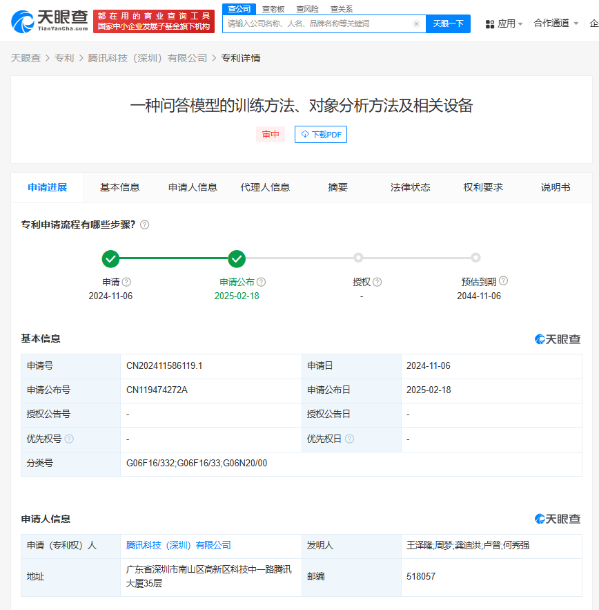 天眼查知识产权信息显示,2月18日,腾讯科技(深圳)有限公司申请的“一种问答模型的训练方法、对象分析方法及相关设备”专利公布。