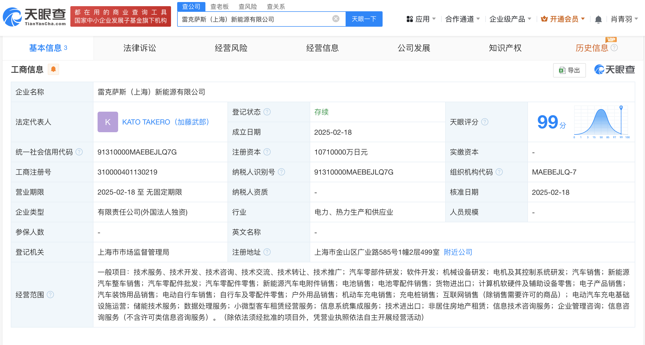 天眼查App显示,近日,雷克萨斯(上海)新能源有限公司成立,法定代表人为KATO TAKERO(加藤武郎),注册资本1071亿日元,经营范围含汽车零部件研发、软件开发、机械设备研发、电机及其控制系统研发、汽车销售、新能源汽车整车销售、汽车零配件批发等,由丰田汽车公司全资持股。