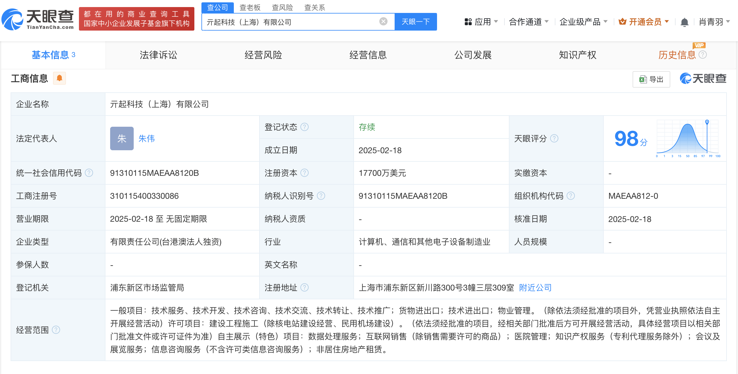 天眼查App显示,近日,亓起科技(上海)有限公司成立,法定代表人为朱伟,注册资本1.77亿美元,经营范围含数据处理服务、互联网销售、医院管理、知识产权服务、会议及展览服务、信息咨询服务等,由中国海外建设集团有限公司全资持股。