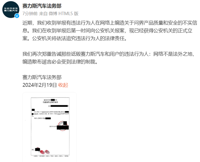 赛力斯汽车法务部2月19日发文:近期,我们收到举报有违法行为人在网络上编造关于问界产品质量和安全的不实信息。我们在收到举报后第一时间向公安机关报案,现已经获得公安机关的正式立案。公安机关将依法追究违法行为人的法律责任。我们再次郑重告诫那些诋毁赛力斯汽车和用户的违法行为人:网络不是法外之地,编造散布谣言必会受到法律的制裁。