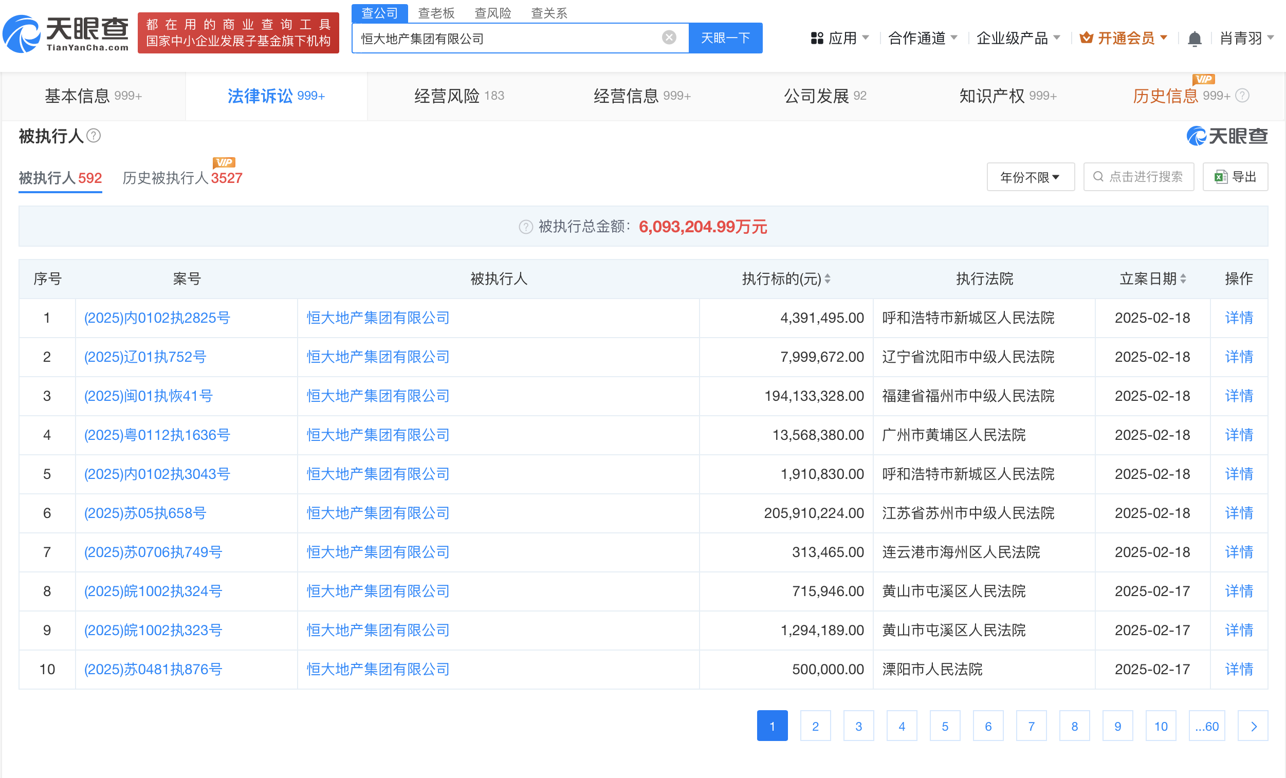 天眼风险信息显示,恒大地产集团有限公司现存590余条被执行人信息,被执行总金额超609亿元。此外,该公司还存在多条限制消费令、失信被执行人(老赖)及终本案件信息。