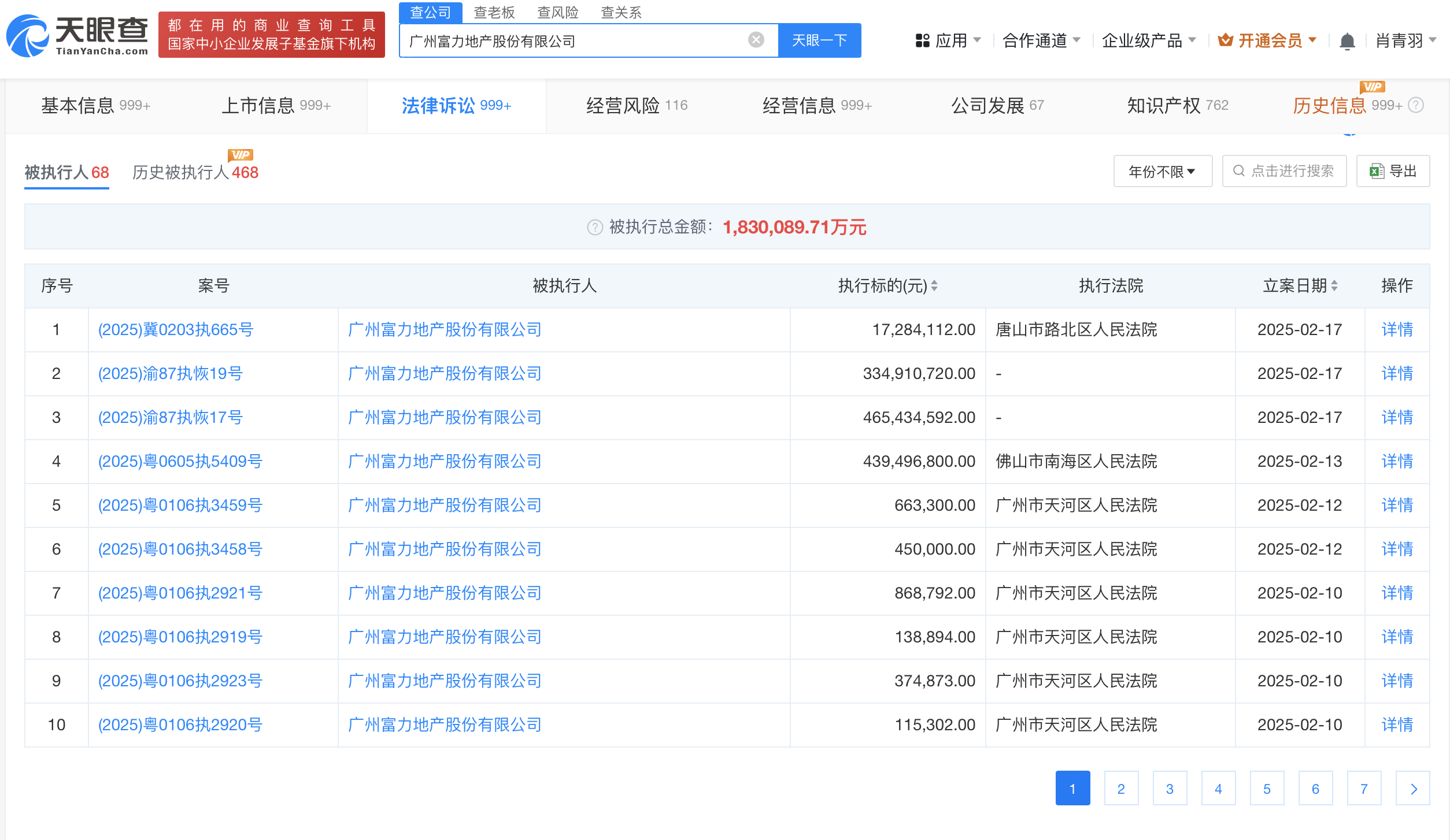 天眼风险信息显示,广州富力地产股份有限公司现存60余条被执行人信息,被执行总金额超183亿元。此外,该公司还存在多条限制消费令、失信被执行人(老赖)及终本案件信息。