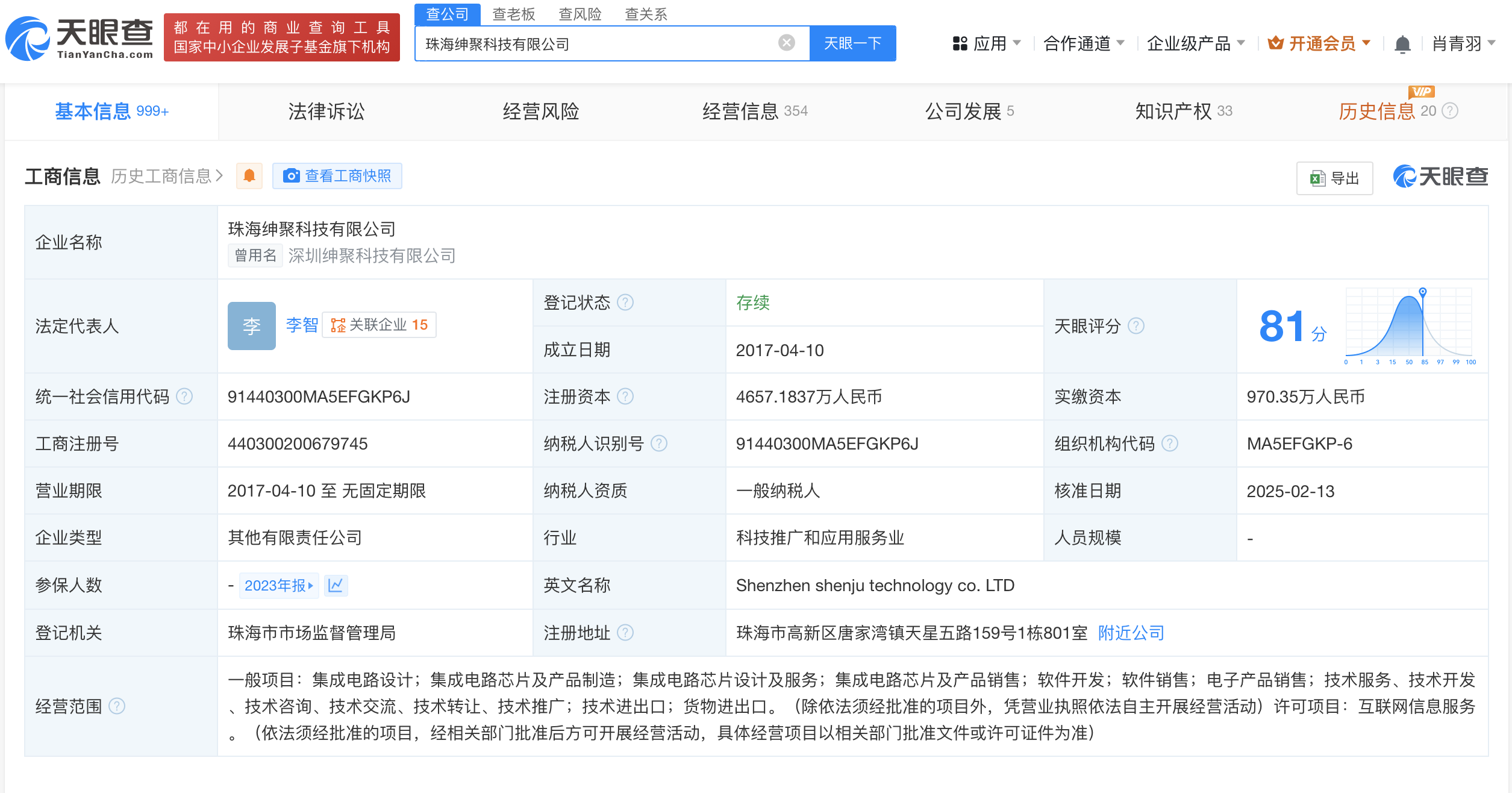 该公司成立于2017年4月,法定代表人为李智,经营范围包括集成电路设计、集成电路芯片及产品制造、集成电路芯片设计及服务、集成电路芯片及产品销售、软件开发、软件销售、电子产品销售等,现由李智、珠海慧聚未来科技合伙企业(有限合伙)及上述新增股东等共同持股。
