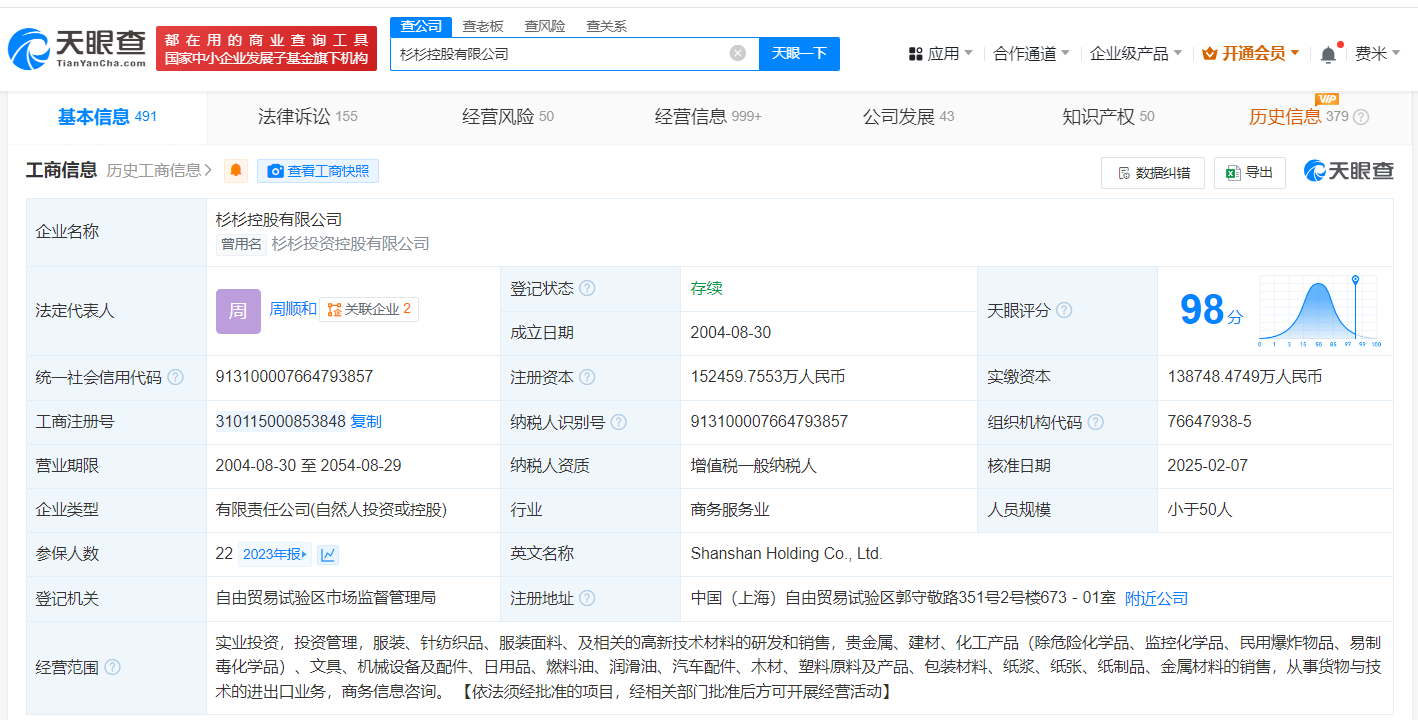 杉杉控股有限公司成立于2004年8月,注册资本约15.25亿人民币,由宁波青刚投资有限公司、昆明锦苑安杉投资合伙企业(有限合伙)、宁波鑫润佳盈贸易有限公司等共同持股。天眼风险信息显示,该公司现存多条被执行人信息,此外,该公司所持多家公司股权已被冻结。