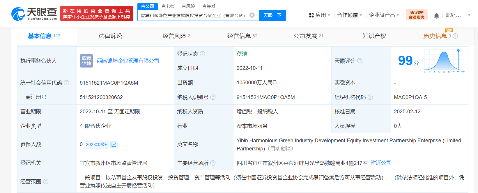 宜宾和谐绿色产业发展股权投资合伙企业(有限合伙)成立于2022年10月,执行事务合伙人为西藏锦坤企业管理有限公司,经营范围为以私募基金从事股权投资、投资管理、资产管理等活动。合伙人信息显示,该企业现由宜宾发展创投有限公司、西藏锦旭企业管理有限公司等及上述新增股东共同出资。