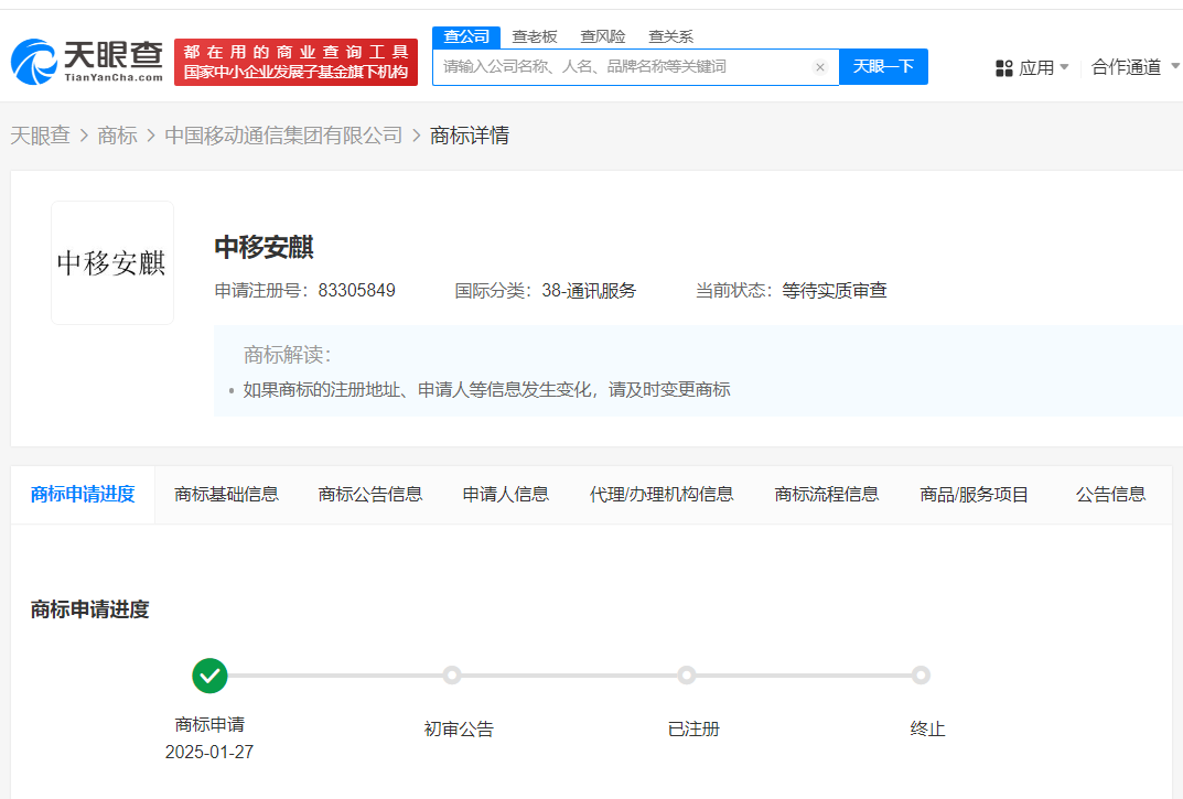 天眼查知识产权信息显示,近日,中国移动通信集团有限公司申请注册“中移智安麒”“中移安麒”商标,国际分类为通讯服务、科学仪器,当前商标状态均为等待实质审查。