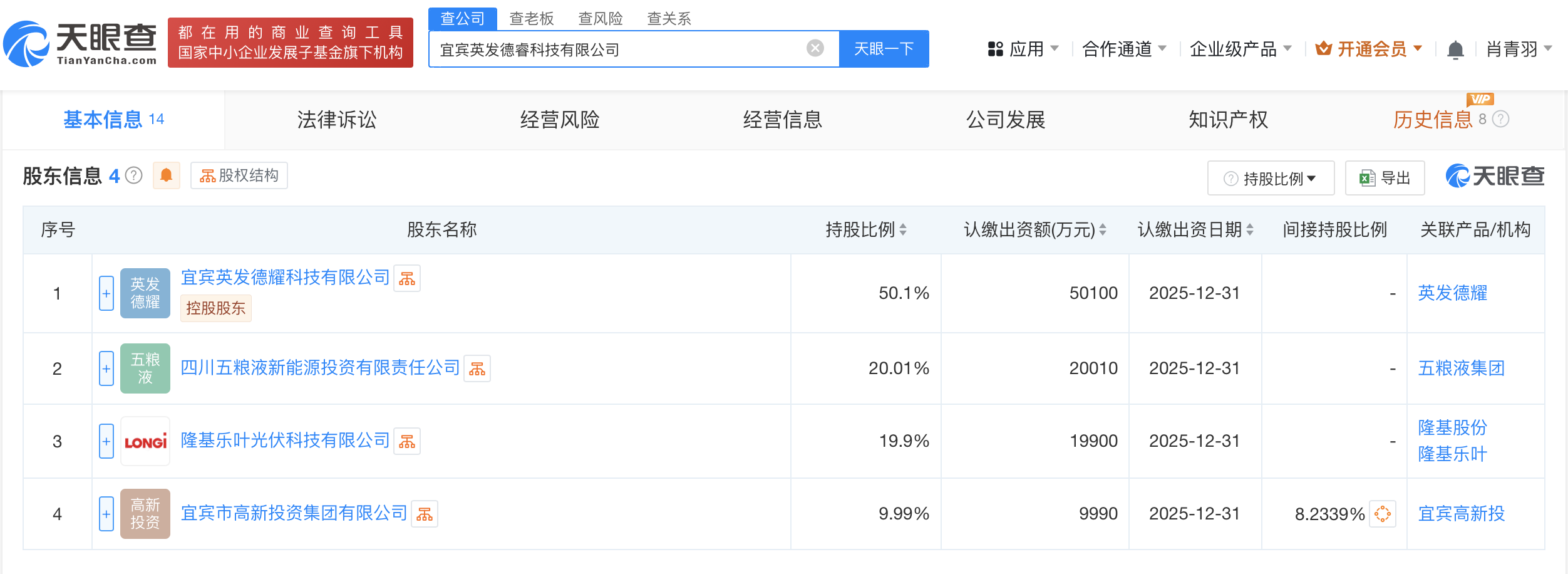 天眼查App显示,近日,宜宾英发德睿科技有限公司成立,法定代表人为张发玉,注册资本10亿人民币,经营范围包括光伏设备及元器件制造、太阳能热利用装备销售、太阳能热发电装备销售、电子专用材料研发、电子专用材料制造等。股东信息显示,该公司由宜宾英发德耀科技有限公司、五粮液集团旗下四川五粮液新能源投资有限责任公司、隆基乐叶光伏科技有限公司、宜宾市高新投资集团有限公司共同持股。