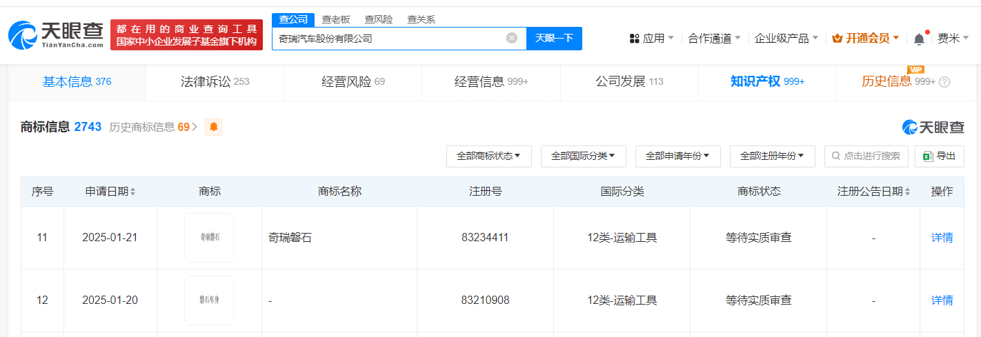 天眼查知识产权信息显示,近日,奇瑞汽车股份有限公司申请注册“奇瑞磐石”“磐石车身”商标,国际分类均为运输工具,当前商标状态均为等待实质审查。