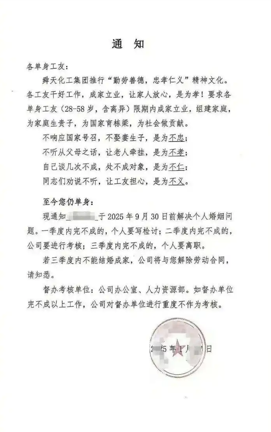 《通知》提醒该员工“至今您仍是单身”,现通知你于2025年9月30日前解决个人婚姻问题。一季度内完不成的,个人要写检讨;二季度内完不成的,公司要进行考核;三季度内完不成的,个人要离职。《通知》尤其强调:若三季度内不能结婚成家,公司将与您解除劳动合同。