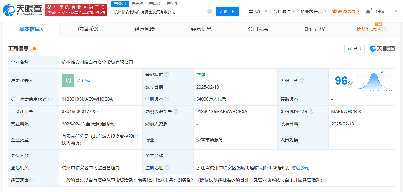 天眼查App显示,近日,杭州临安创临自有资金投资有限公司成立,法定代表人为周伊倩,注册资本5.4亿人民币,经营范围包括以自有资金从事投资活动、商务代理代办服务、财务咨询等。股东信息显示,该公司由杭州临安金融控股集团有限公司全资持股。