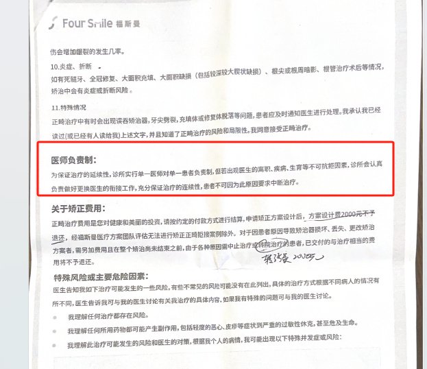 该家长透露,知情同意书上的医师责任制条款规定:为保证治疗的连续性,诊所实行单一医师对单一患者负责制,但若遇到医生离职、疾病、生育等不可抗力因素,诊所将确保做好医生的衔接工作,以充分保障治疗的连续性,患者不得因此要求中断治疗进程。