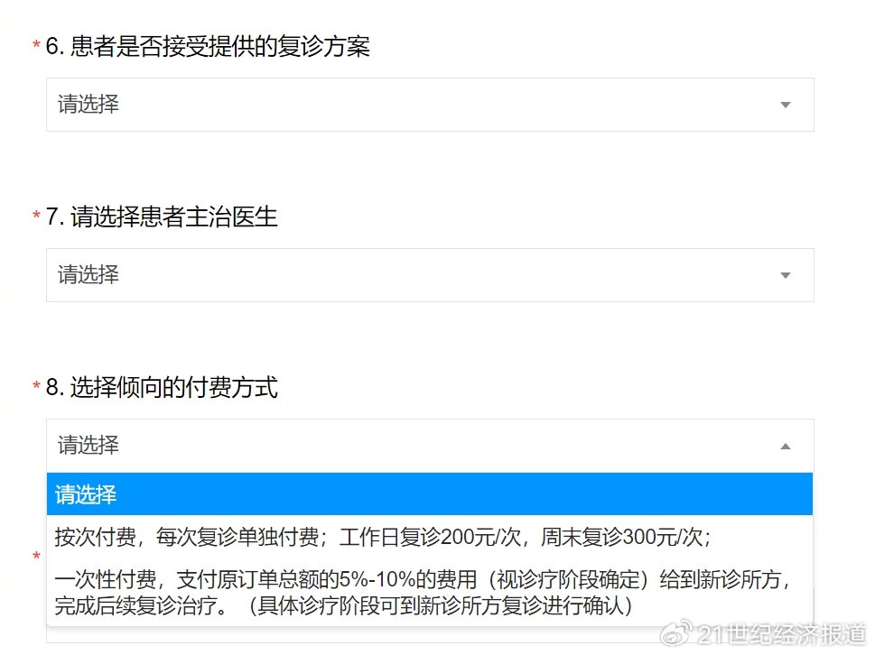 2月13日,一份汉中路店患者复诊接受意向及联系方式收集表出现,提供了三种复诊收费方式供患者选择。
