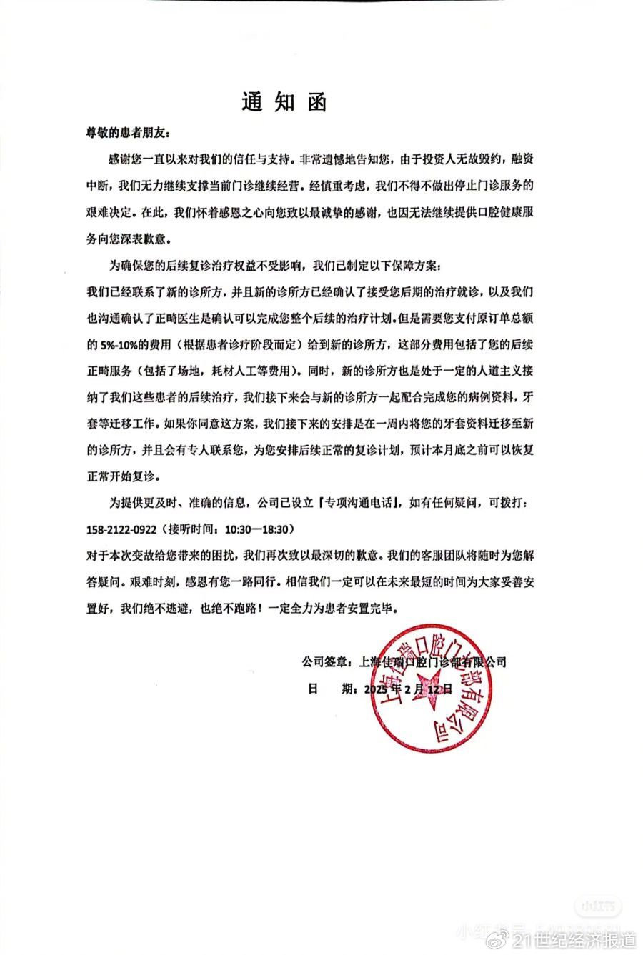 2月12日,一份落款为上海口腔门诊部有限公司的通知函声明,已沟通确认正畸医生可以完成后续治疗计划。但需要患者支付原订单总额的5%~10%费用(根据患者诊疗阶段而定)给到新的诊所方,这部分费用包括了患者的后续正畸服务(包括了场地,耗材人工等费用)。如果患者同意此方案,在一周内将牙套资料迁移至新的诊所,预计本月底之前可以恢复正常开始复诊。