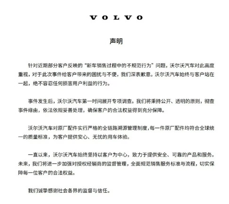 关于沃尔沃品牌方对此事是否默许,是否负有监管责任,后续如何处理等问题,对方表示,不会默许4S店这种行为,后续将督促相关经销商积极与消费者沟通,结合具体情况妥善处理。