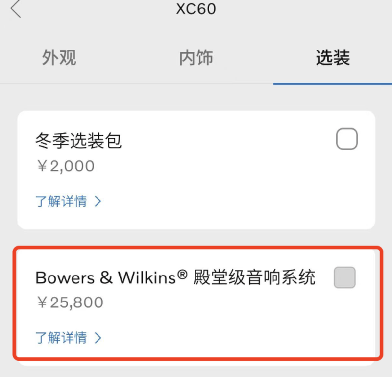 宝华韦健(Bowers&Wilkins)是英国高端音响品牌,成立于1966年,素有音响界的劳斯莱斯美称。蓝鲸记者查询沃尔沃官方app发现,选装一套宝华韦健音响的价格为25800元。