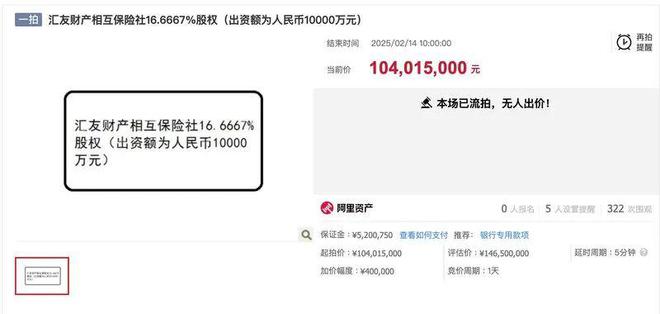 昨日10时,汇友财产相互保险社(以下简称“汇友相互”)16.67%股权拍卖结束,最终以无人出价,流拍结局。